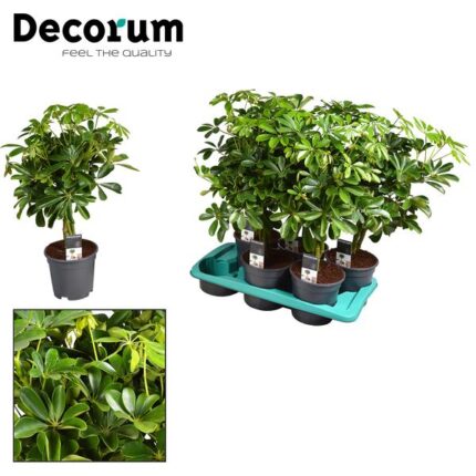 De Schefflera staat bekend om zijn opvallende geveerde bladeren die een prachtig tropisch accent toevoegen aan elke omgeving. Met zijn dichte bladerdek biedt deze plant niet alleen een esthetische waarde, maar kan ook dienen als een uitstekende sfeermaker en ruimteverdeler in huis of op kantoor. Bovendien gedijt de Schefflera goed in verschillende lichtomstandigheden, waardoor het een ideale keuze is voor zowel goed verlichte ruimtes als kamers met minder natuurlijk licht.